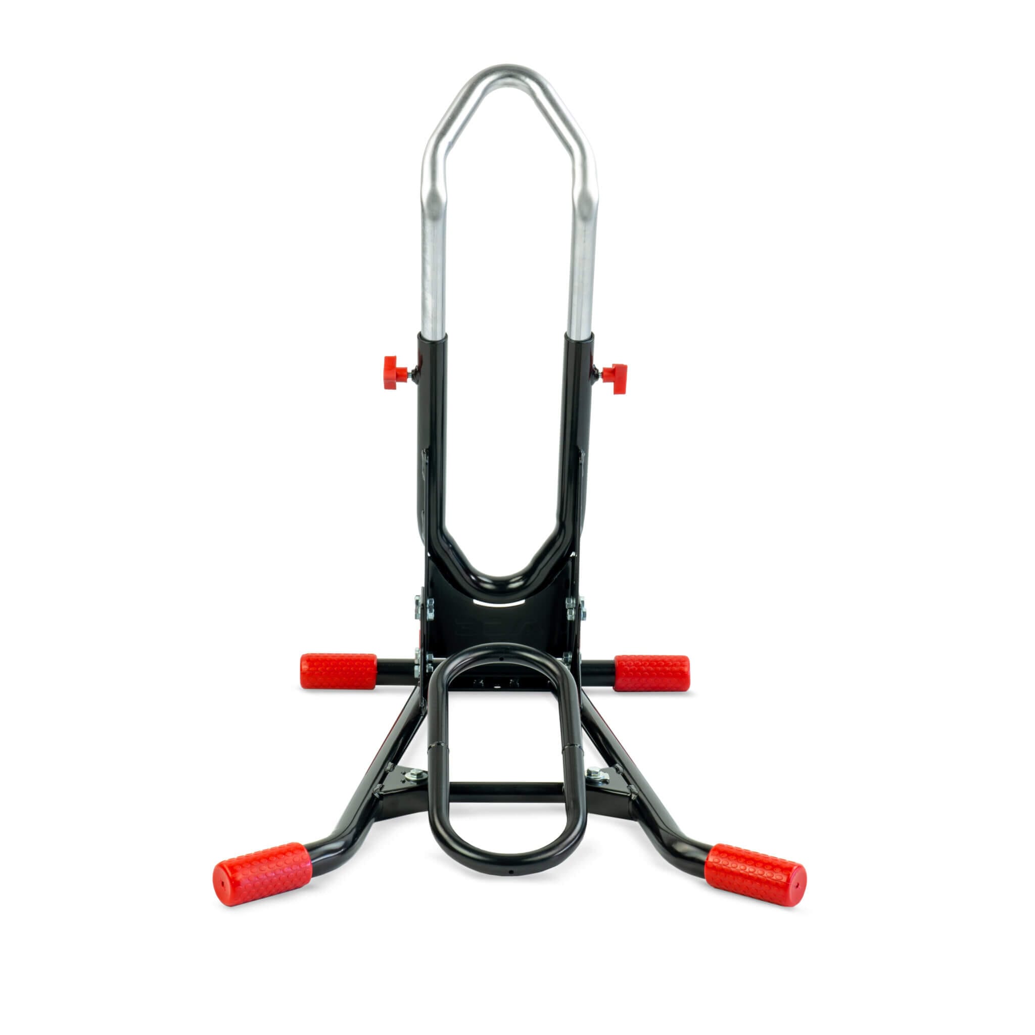 Thanks to its smart design, the Cross Flex can be used in multiple situations: for parking your bike in the garage, at events or race days, during maintenance and cleaning, or to keep the motorcycle securely upright during transport*. The front wheel is firmly supported, preventing the bike from tipping over while still allowing quick and easy placement. Whether you are working on your bike, washing it, storing it, or loading it for transport, the SteadyStand Cross Flex offers a reliable and flexible solution for every motocross and enduro rider.